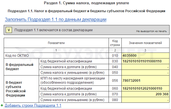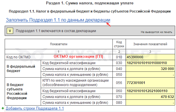 Оба подраздела заполняются автоматически по данным декларации. В декларации по всей организации Подраздел 1.1 заполняется суммами к уплате (уменьшению) в: