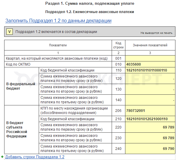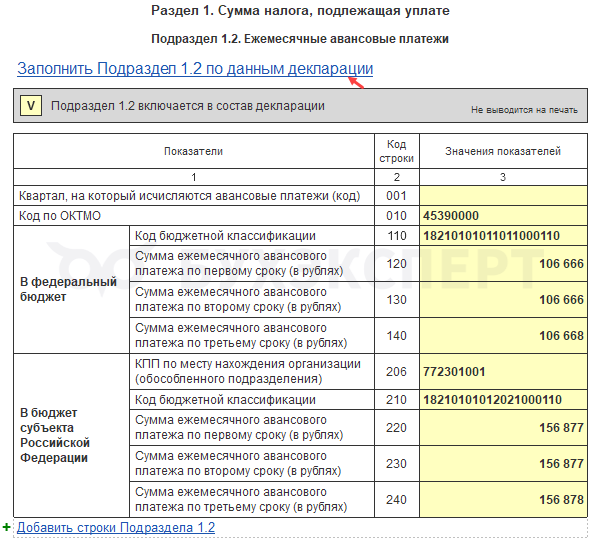 Подраздел 1.2 заполняется суммами ежемесячных авансовых платежей на следующий за отчетным период в: