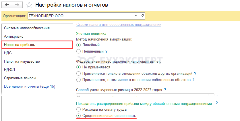 В настройках Налога на прибыль (Главное – Налоги и отчеты) выберите трудовой показатель, который будет участвовать в автоматическом распределении прибыли между обособленными подразделениями. В нашем примере это Среднесписочная численность.