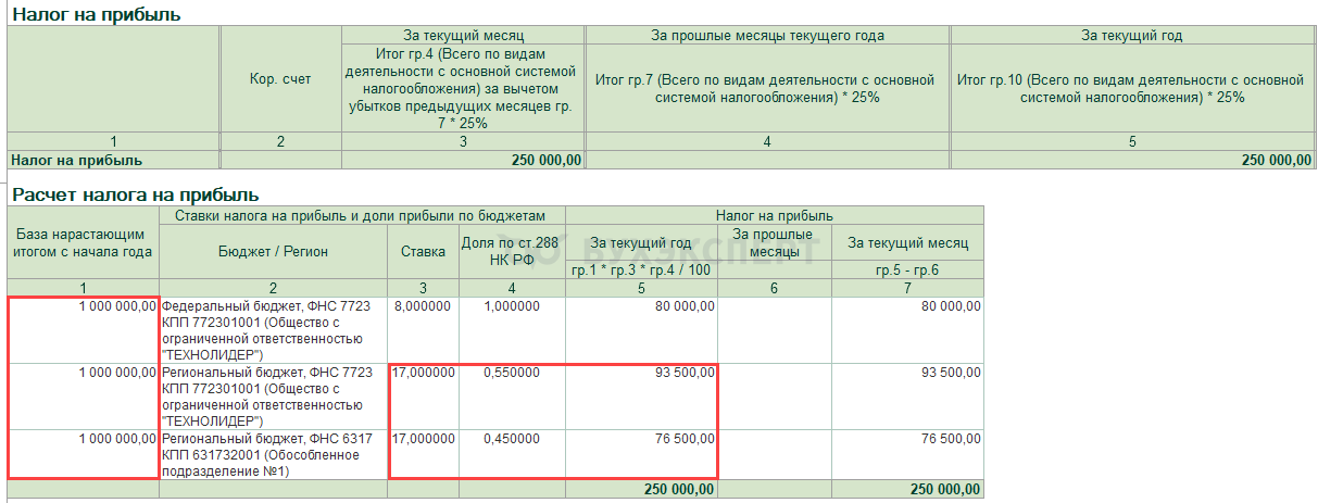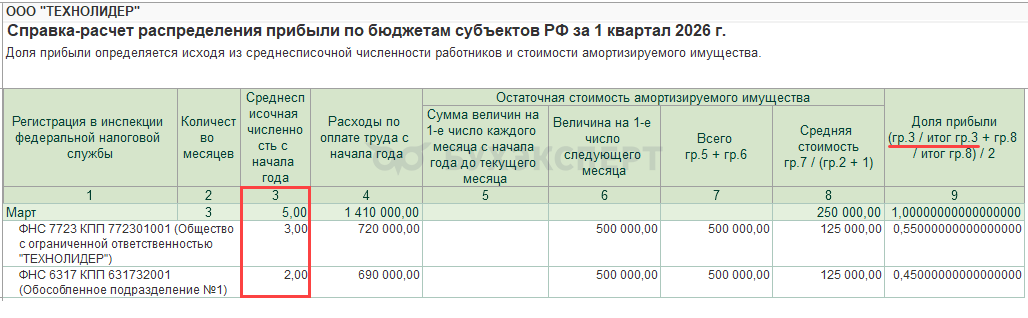 Расчет доли приведен в Справке-расчете распределения прибыли по бюджетам субъектов РФ (Операции – Закрытие месяца – Расчет налога на прибыль) за отчетный период.