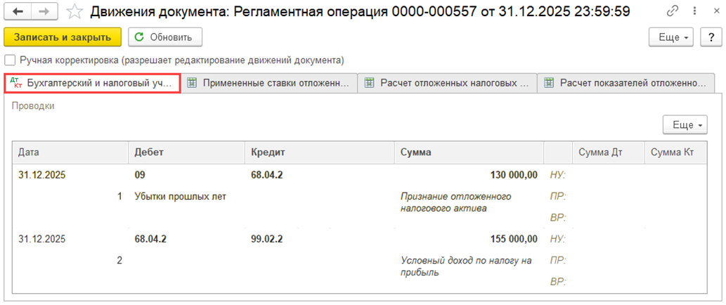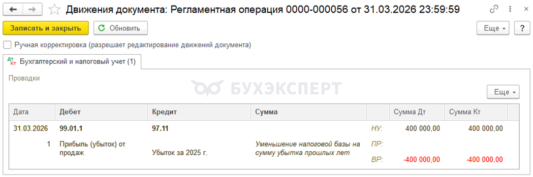 Регламентная операция формирует проводку по переносу убытка на будущие налоговые периоды по субсчету 97.11 «Убытки прошлых лет по налогу на прибыль» рабочего плата счетов 1С с субконто РБП Убыток за 2025 г., который не доступен для редактирования в ручном режиме.