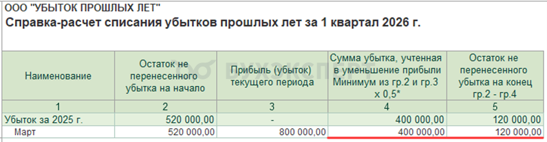 В сноске отчета Справка — расчет списания убытков прошлых лет есть напоминание: «В отчетные (налоговые) периоды с 1 января 2017 года по 31 декабря 2030 года налоговая база за текущий отчетный (налоговый) период не может быть уменьшена на сумму убытков, полученных в предыдущих налоговых периодах, более чем на 50 процентов» (п. 2.1 ст. 283 НК РФ)».