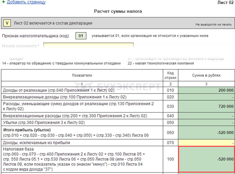 - Листе 02 стр. 110 «Сумма убытка или части убытка, уменьшающего налоговую базу за отчетный (налоговый) период (стр. 150 Приложения № 4 к Листу 02)»