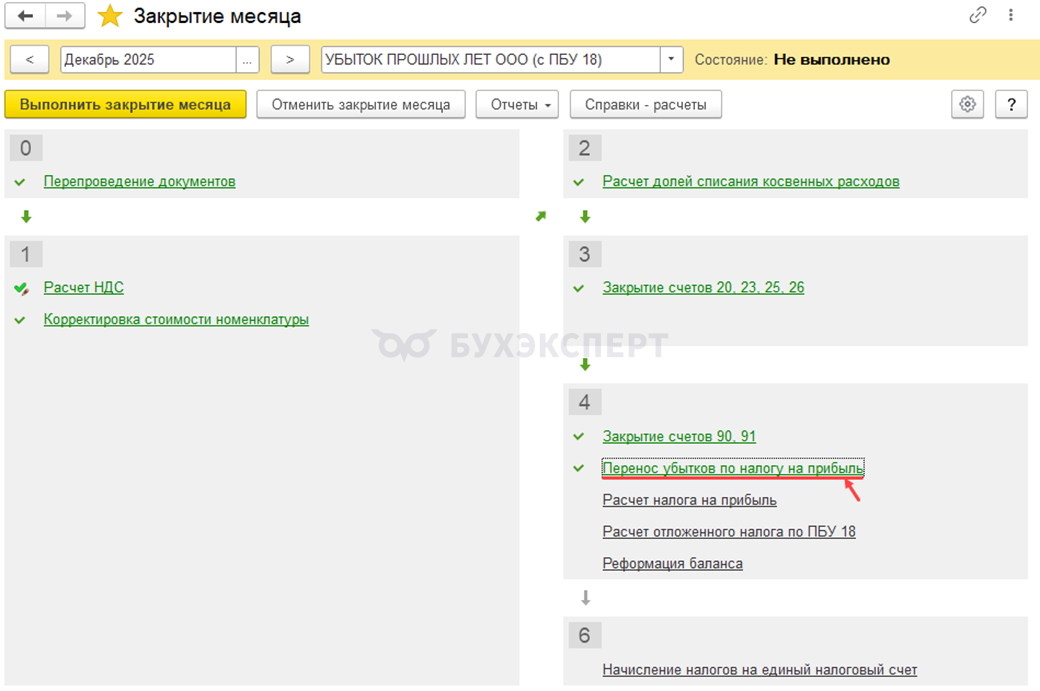 Для определения убытка по налоговому учету запустите процедуру Закрытие месяца (раздел Операции — Закрытие месяца) по следующему алгоритму: