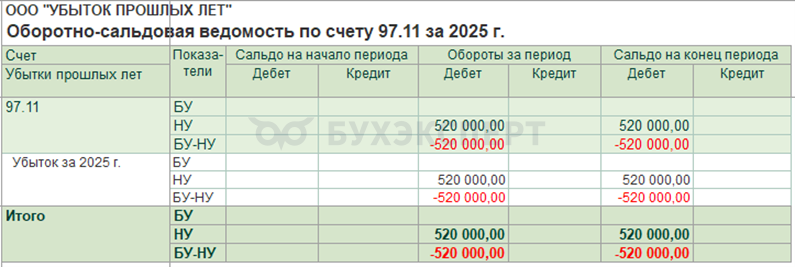 Проверьте результат переноса убытка по отчету Оборотно-сальдовая ведомость по счету 97.11 (Отчеты — Оборотно-сальдовая ведомость по счету):