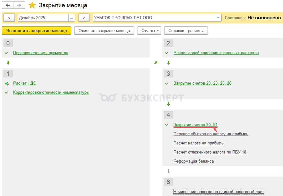 Для определения убытка по налоговому учету запустите процедуру Закрытие месяца (раздел Операции — Закрытие месяца) по следующему алгоритму: