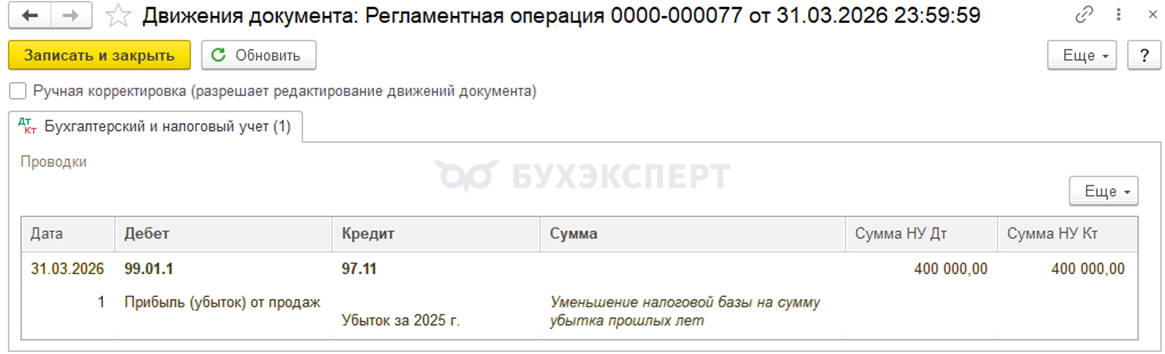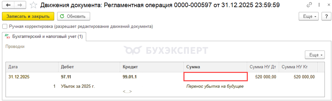 Регламентная операция формирует проводку по переносу убытка на будущие налоговые периоды по субсчету 97.11 «Убытки прошлых лет по налогу на прибыль» рабочего плата счетов 1С с субконто РБП Убыток за 2025 г., который не доступен для редактирования в ручном режиме.