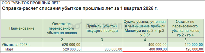 - остаток несписанного убытка: 520 000 — 400 000 = 120 000 руб.
