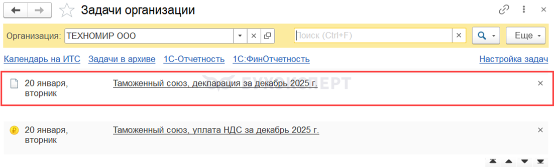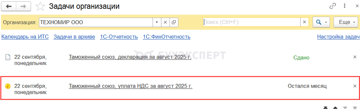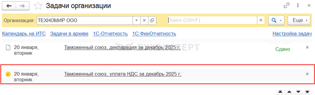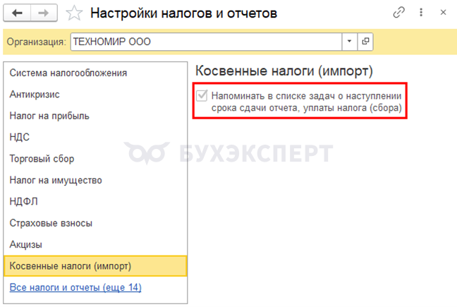 Чтобы напоминание о сдаче декларации и уплате налога появилось в Задачах организации, установите флажок в разделе Главное – Налоги и отчеты – Косвенные налоги (импорт).