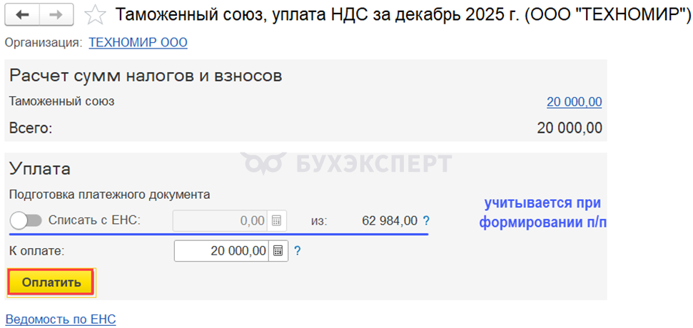 Документ формирует проводку по переносу начисленного налога на ЕНС датой уплаты.
