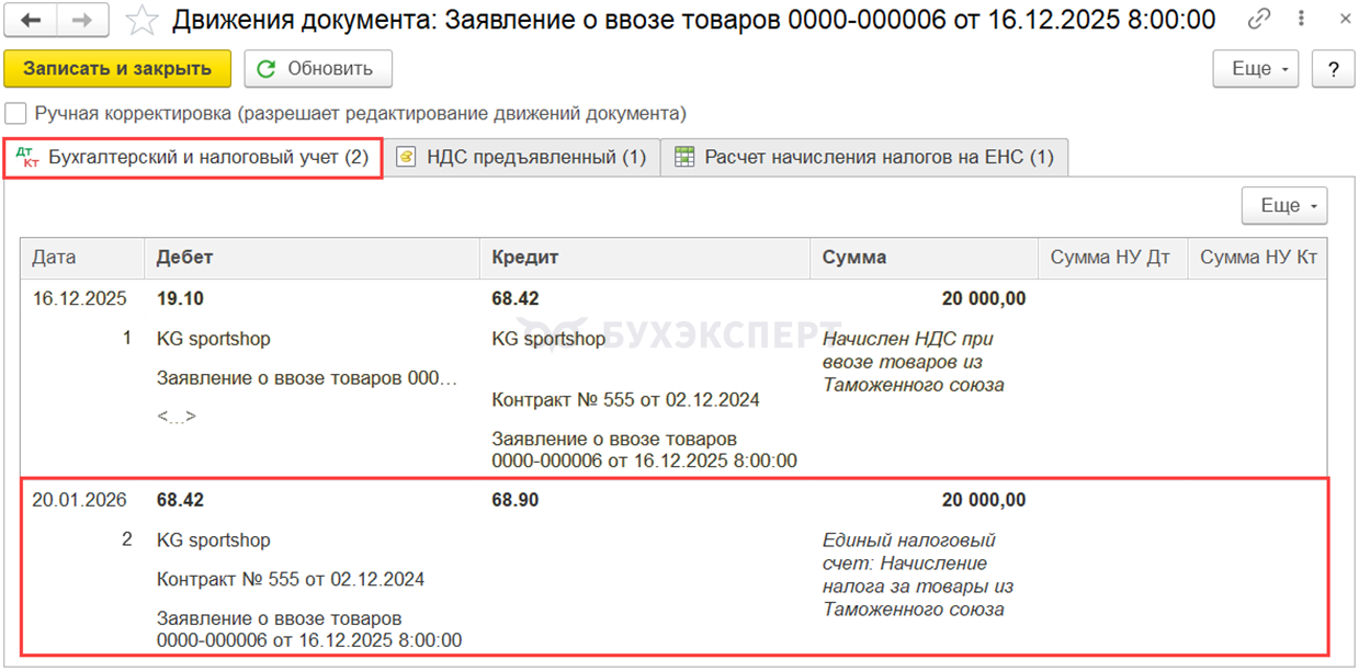 Внимание! С 2026 года в 1С планируется изменение в механизме переноса начисленных налогов и взносов на ЕНС. Налоговая обязанность на счете 68.90 будет формироваться:
