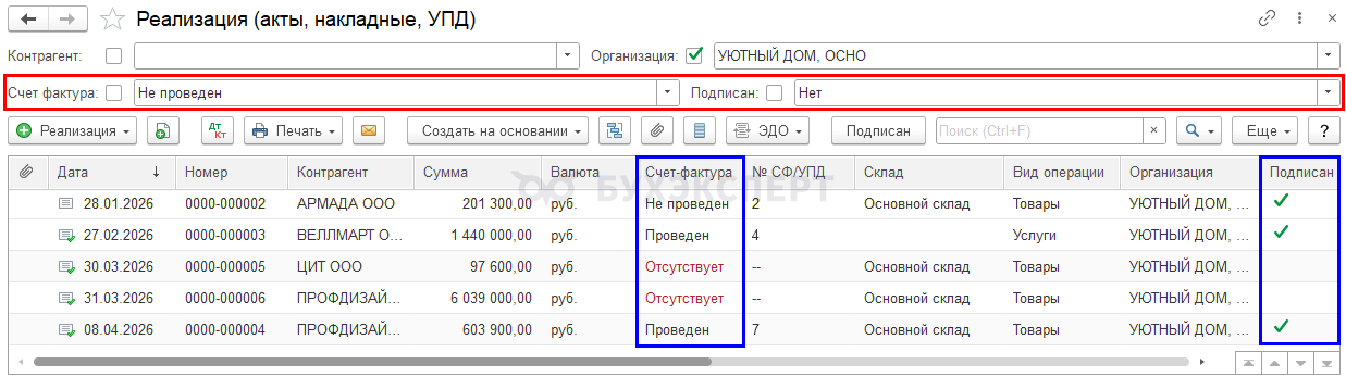 Журнал Реализация (акты, накладные, УПД) — статус документов (Подписан, Не подписан) и статус СФ (Проведен, Не проведен, Не требуется, Отсутствует) => отсортировать по статусу.