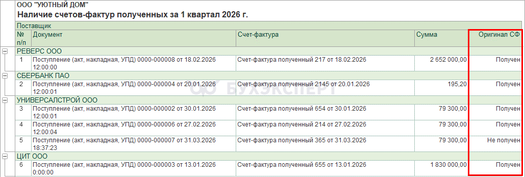 Журнал Поступление (акты, накладные, УПД) — статус оригиналов документов (получен, не получен) и статус СФ (Проведен, Не проведен, Не требуется, Отсутствует) => отсортировать по статусу.