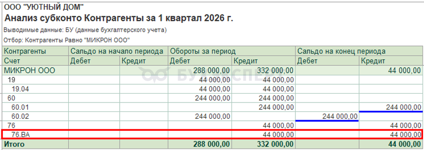 - Анализ субконто Контрагенты со счетами 76.ВА, 76.АВ, 19
