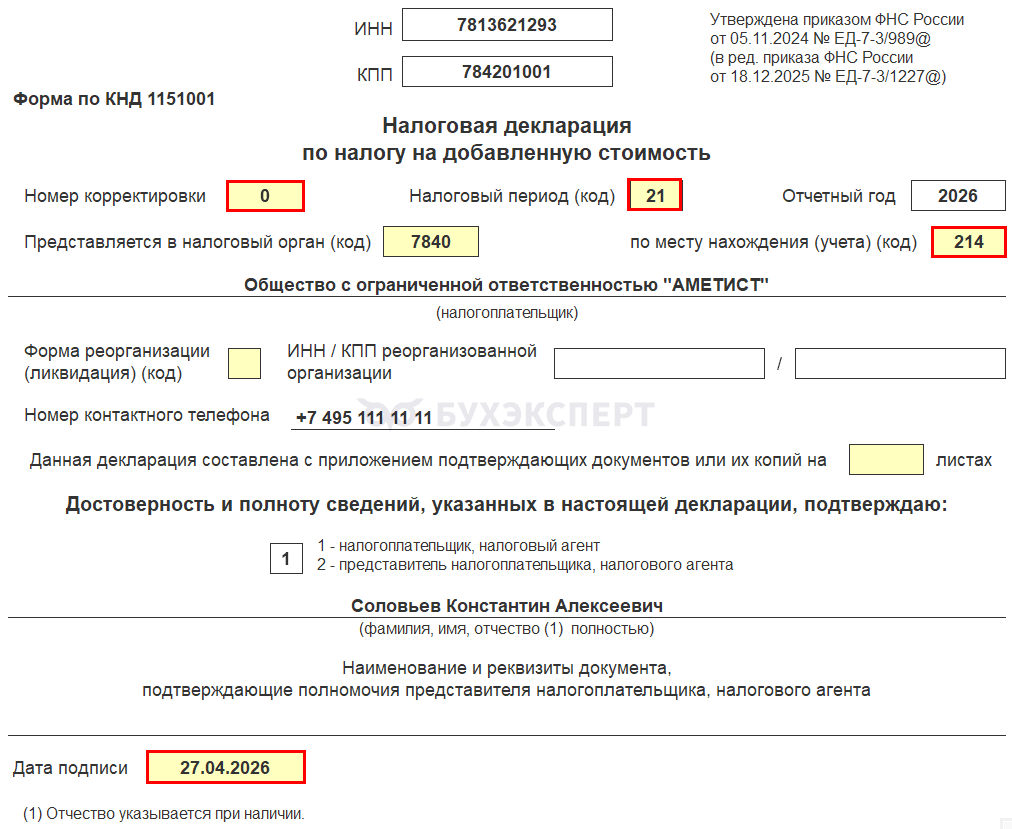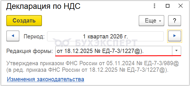 Форма: налоговая декларация по НДС сдается по форме и формату, утвержденным Приказом ФНС от 05.11.2024 N ЕД-7-3/989@, в редакции Приказа ФНС от 18.12.2025 N ЕД-7-3/1227@