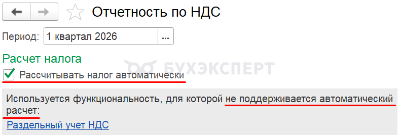 Если в 1С ведется раздельный учет входящего НДС (а также комиссионная торговля, импорт/экспорт, операции налогового агента и пр.), вручную выполните: