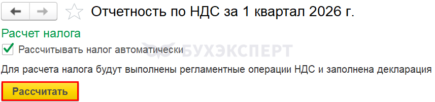 Если в 1С не ведется раздельный учет входящего НДС (и не используется другая функциональность, для которой авторасчет не поддерживается), расчет налога Помощник по НДС осуществляет автоматически по кнопке Рассчитать. Вам останется только проверить результат.
