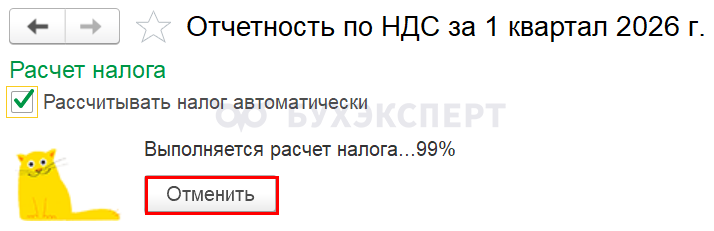 При необходимости отмените запущенный авторасчет НДС по кнопке Отменить. Например, если вы уже внесли какие-то ручные правки в документ Формирование записей книги покупок, а потом случайно нажали кнопку Рассчитать в Помощнике по НДС.