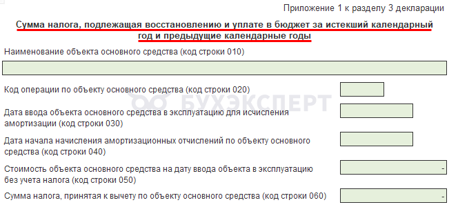 Приложение 1 к разделу 3 декларации по НДС заполняется один раз в год в декларации за 4 квартал при восстановлении НДС по недвижимому имуществу в порядке ст. 171.1 НК РФ, если оно используется в необлагаемой НДС деятельности.