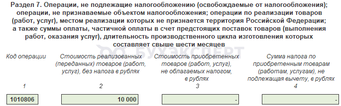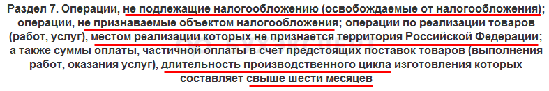 Здесь отражаются операции, по которым НДС платить не требуется. Запоминать, какие именно операции, не надо: они все перечислены в заголовке этого раздела.