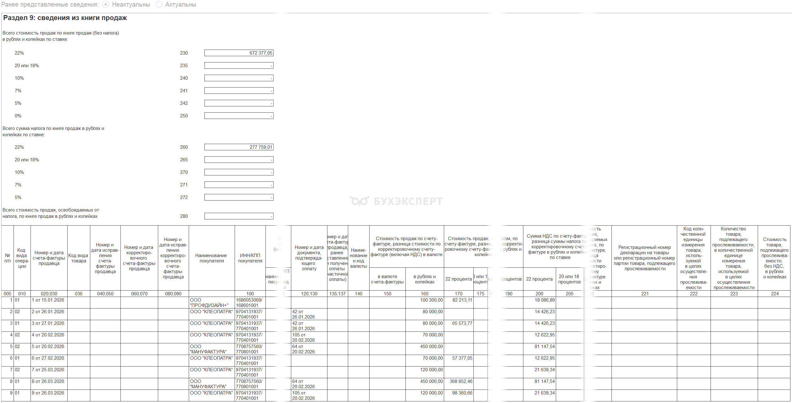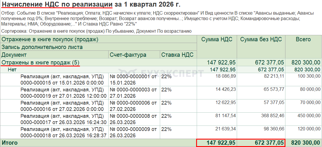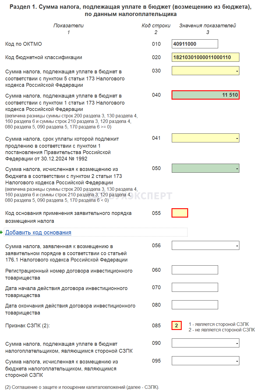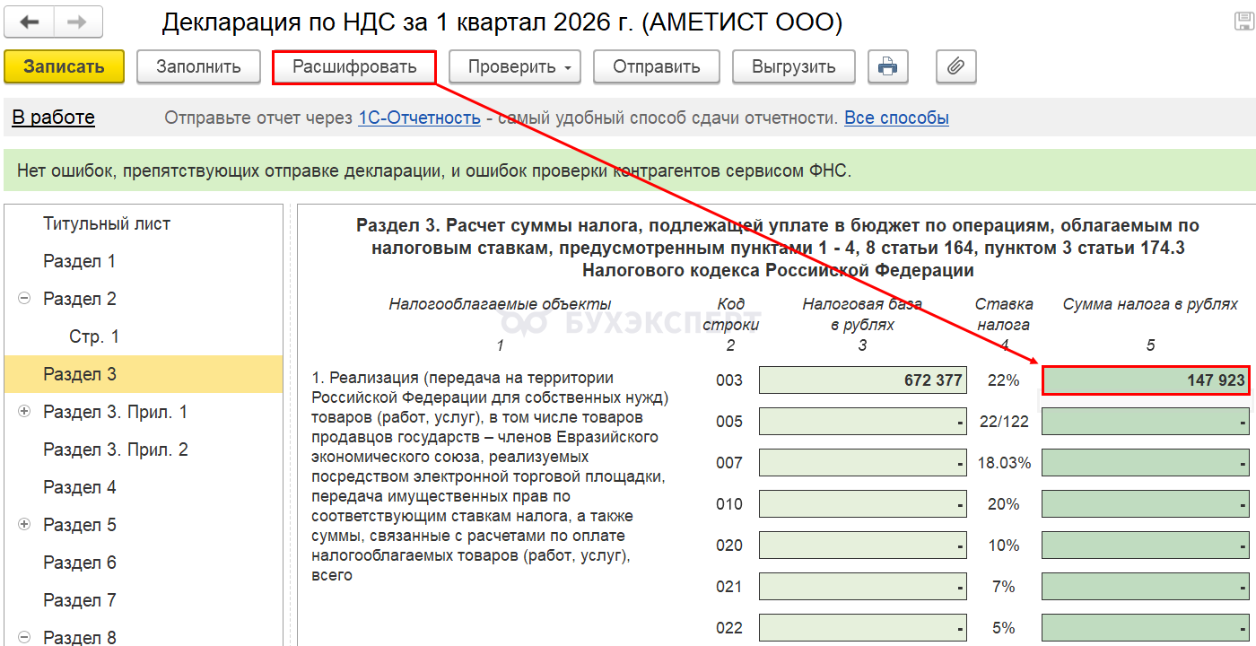 К этому разделу переходим в конце — обычно он итоговый. Заполняется Раздел 1 декларации по НДС автоматически.