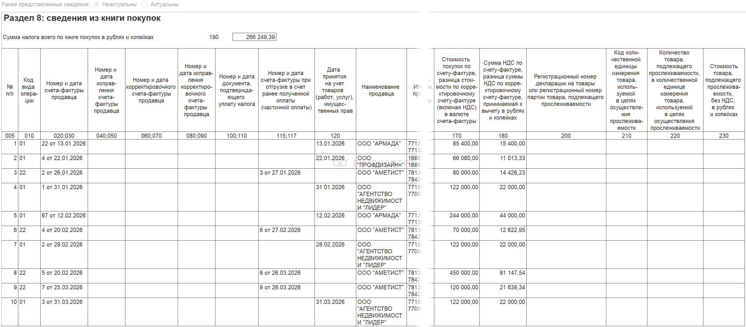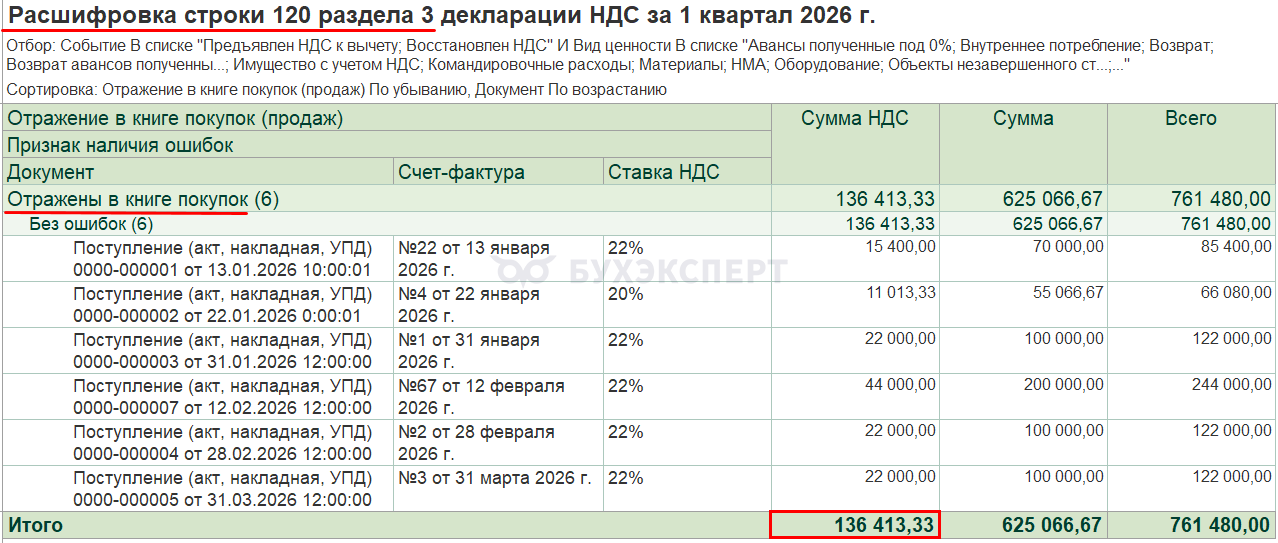 - с 120 по 180 — данные из Регистра накопления НДС покупки