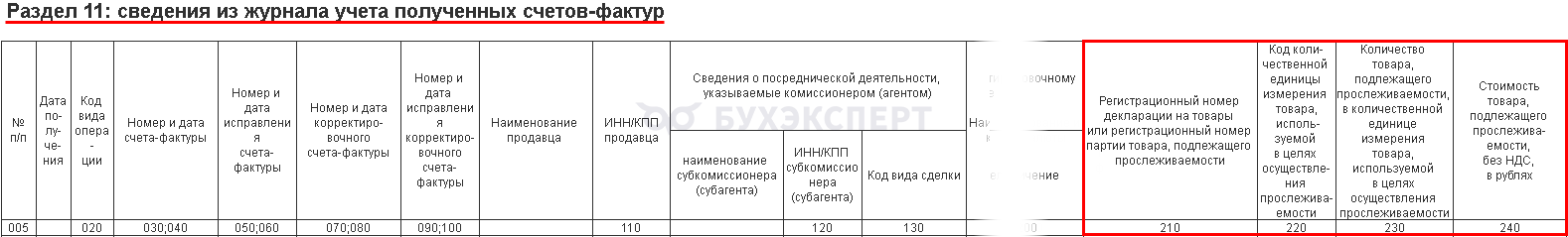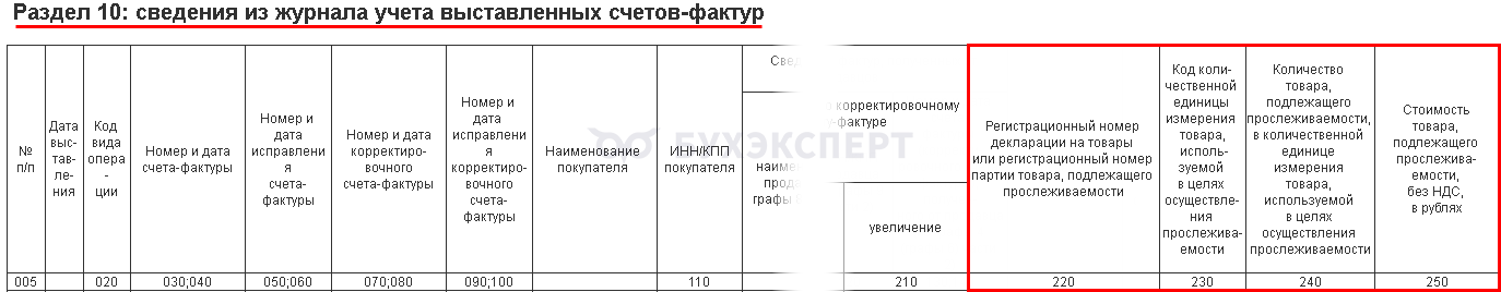 Для прослеживаемых товаров предназначены графы 210-240.