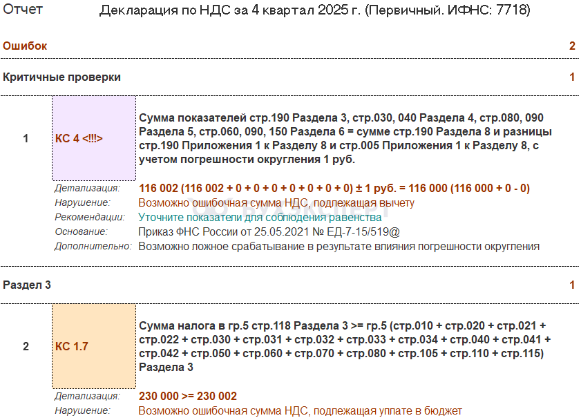 При возникновении ошибки проанализируйте данные по декларации: установите величину расхождений и их причину. Если причиной является округление, а не ошибки, декларацию можно отправить без исправлений, несмотря на предупреждение.