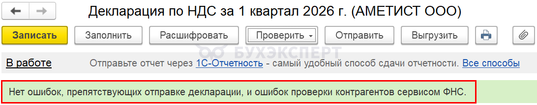Разберем порядок представления декларации по НДС за 1 квартал 2026, а также ее алгоритм заполнения, проверки и уплаты налога в программе 1С 8.3 Бухгалтерия.