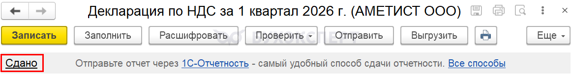 Отправьте отчетность в налоговый орган после успешного выполнения всех проверок через Отправить (при подключенной 1С-Отчетности)/ Выгрузить (для отправки другим оператором).