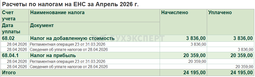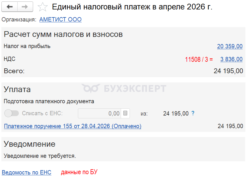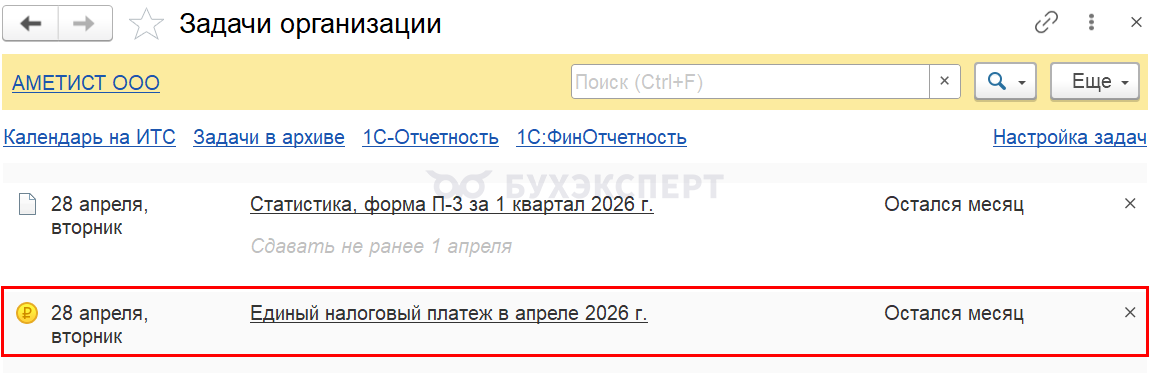 Оплатите налог из раздела Главное — Задачи организации — Единый налоговый платеж в апреле 2026г.