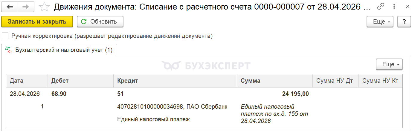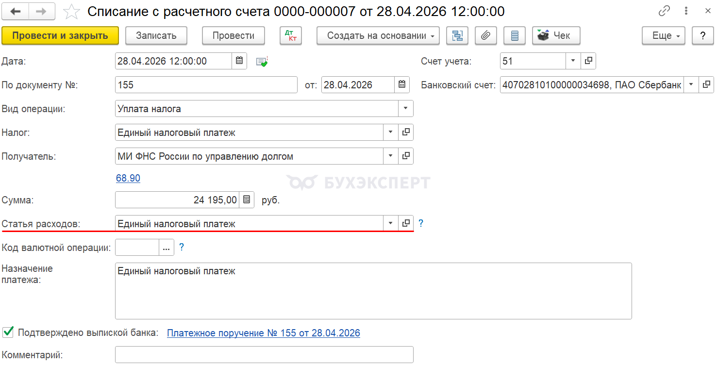 После проведения платежа в бюджет, на основании платежного поручения сформируйте Списание с расчетного счета. Документ формирует проводку по пополнению ЕНС.