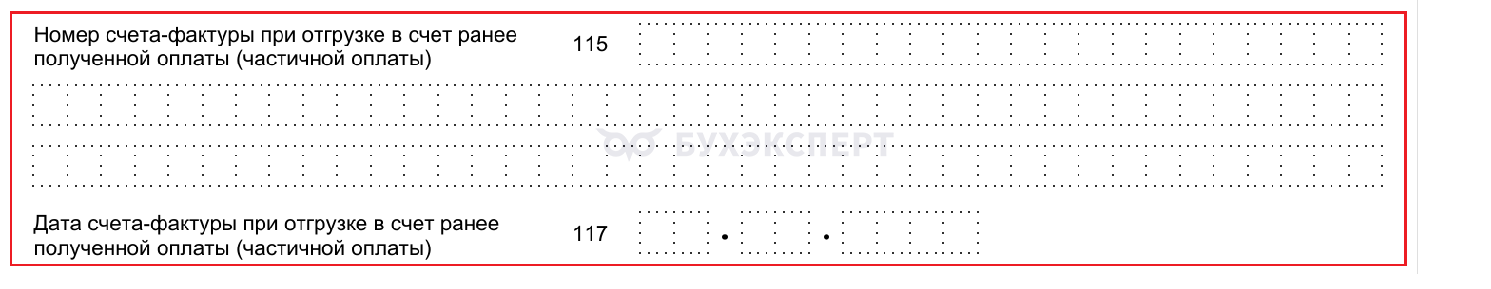 - раздел 8 дополнили новыми строками 115 и 117, в которых отражаются номер и дата отгрузочного СФ в счет ранее полученного аванса