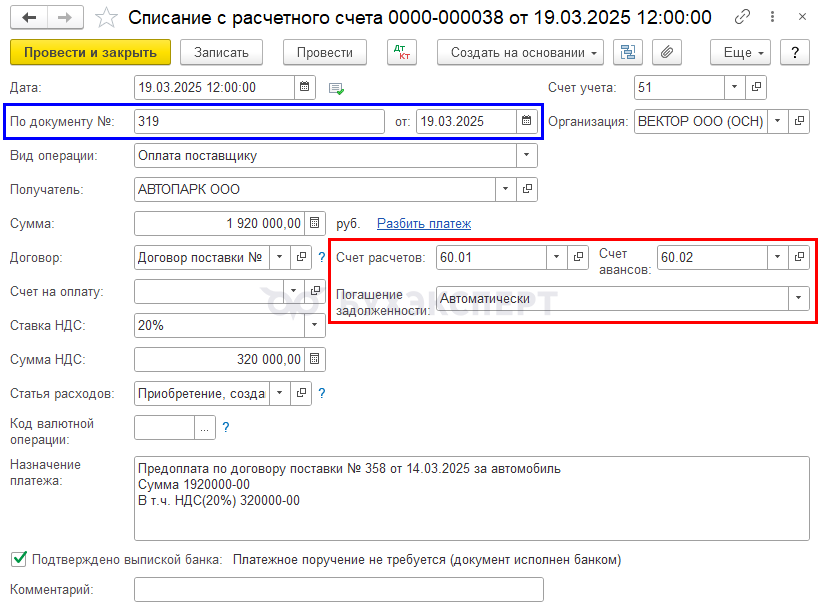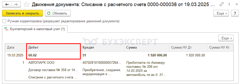 19 марта | 60.02 | 51 | 1 920 000 | 1 920 000 | Перечисление аванса поставщику | Списание с расчетного счета — Оплата поставщику | |