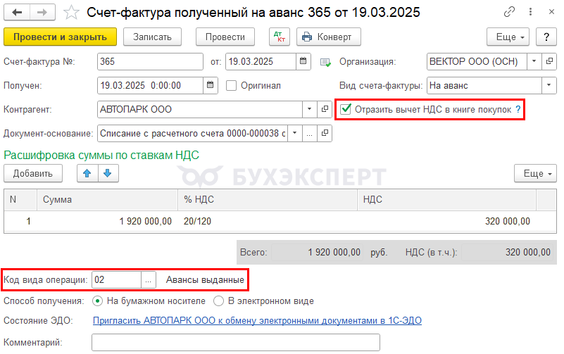 Проверьте, что Код вида операции — 02 «Авансы выданные».