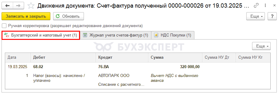 Если в документе установлен флажок Отразить вычет НДС в книге покупок, то при его проведении сформируются проводки по принятию НДС к вычету.