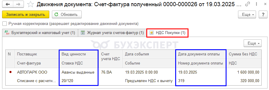 320 000 | Отражение вычета НДС в Книге покупок | Отчет Книга покупок |