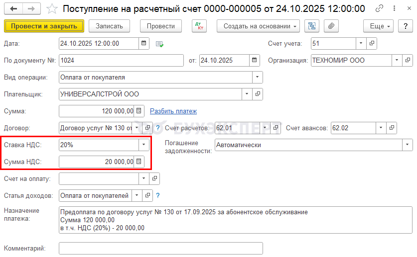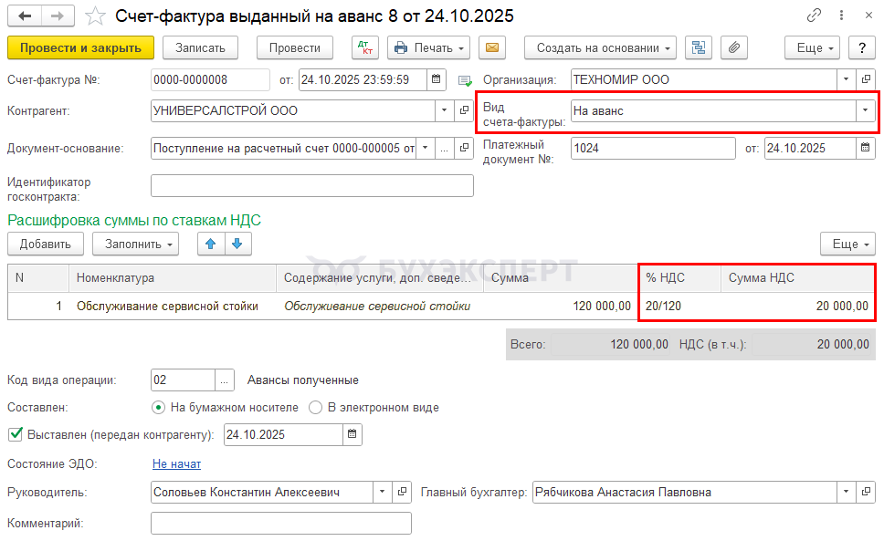 24 октября 2025 получен аванс в сумме 120 000 руб., в т. ч. НДС 20% – 20 000 руб., выставлен СФ на аванс.