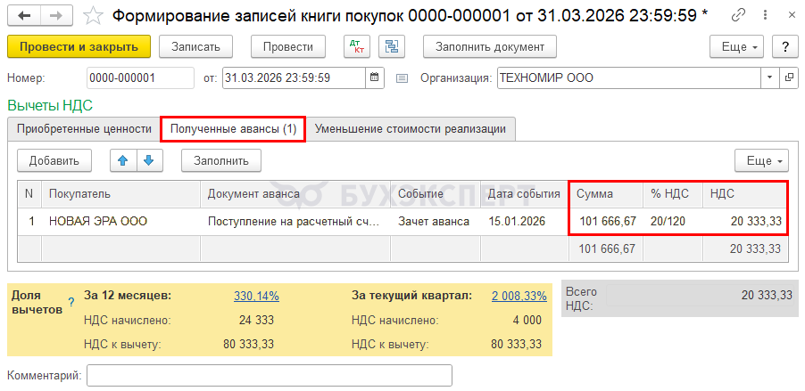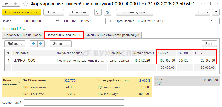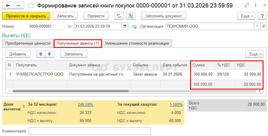 При зачете аванса в 2026 году примите НДС к вычету по тем ставкам, по которым ранее исчислен НДС (п. 6, 8 ст. 172 НК РФ). Для этого перейдите в раздел Операции — Регламентные операции по НДС — кнопка Создать — Формирование записей книги покупок.
