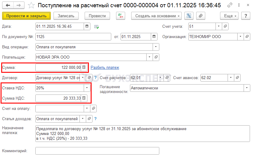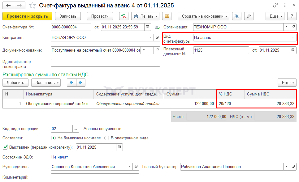 1 ноября 2025 получен аванс в сумме 122 000 руб., в т. ч. НДС (20%) 20 333,33 руб. Выставлен СФ на аванс.