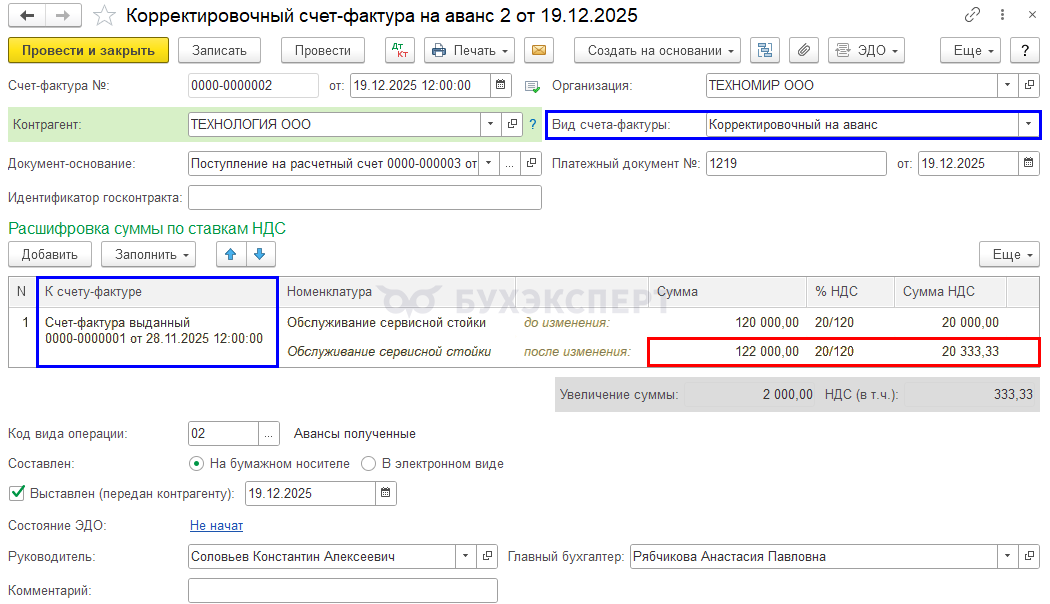 В табличной части укажите новую сумму аванса по ставке % НДС — 20/120.