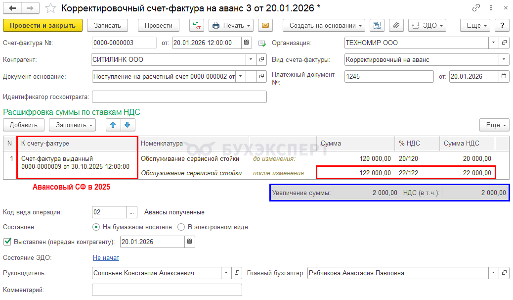 - при оплате в 2025 с учетом повышения ставки НДС до 22% — выставите обычный счет-фактуру на аванс без дополнительных корректировок