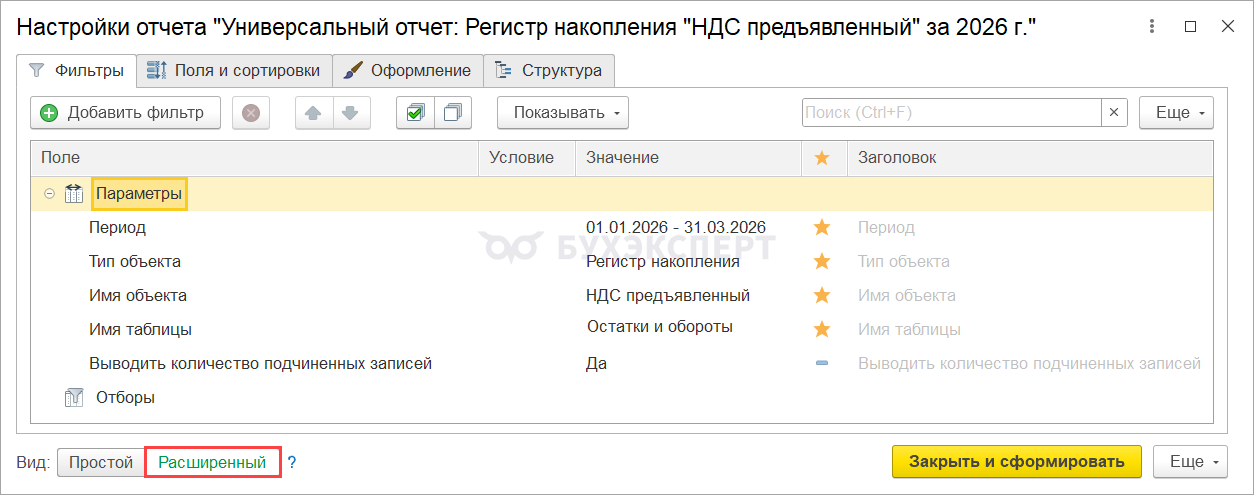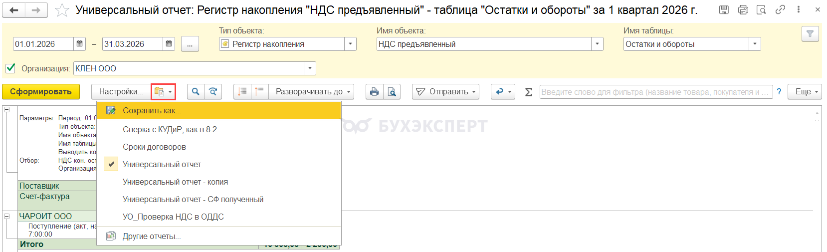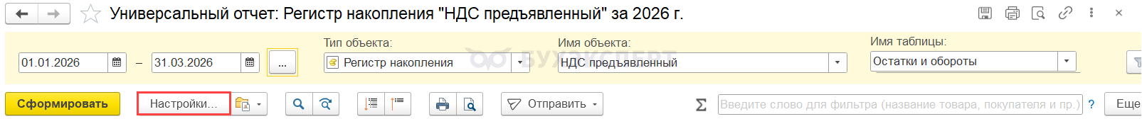 А также получите ссылку на готовую настройку универсального отчета Проверка зависшего НДС для использования ее в своей программе.