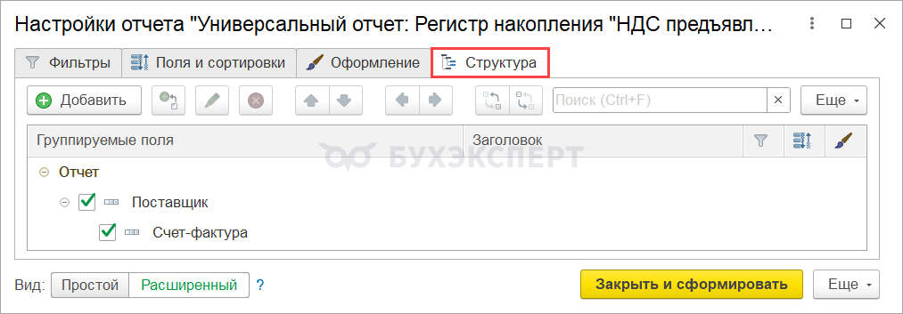 Откройте настройку отчета по кнопке Настройки. Выберите Вид — Расширенный.