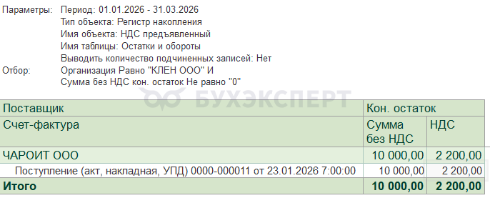 Чтобы разобраться в причинах возникновения этой ситуации и исправить ошибку в программе, воспользуйтесь Универсальным отчетом по регистру накопления НДС предъявленный.