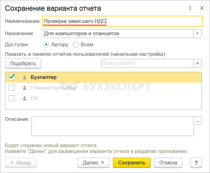 После ввода наименования настройки, например, Проверка зависшего НДС, вам не придется каждый раз настраивать отчет заново. По кнопке Выбрать настройки достаточно обратиться к сохраненной настройке.