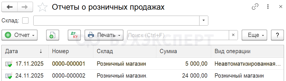 Розничные продажи регистрируйте в течение месяца (квартала) документом Отчет о розничных продажах.