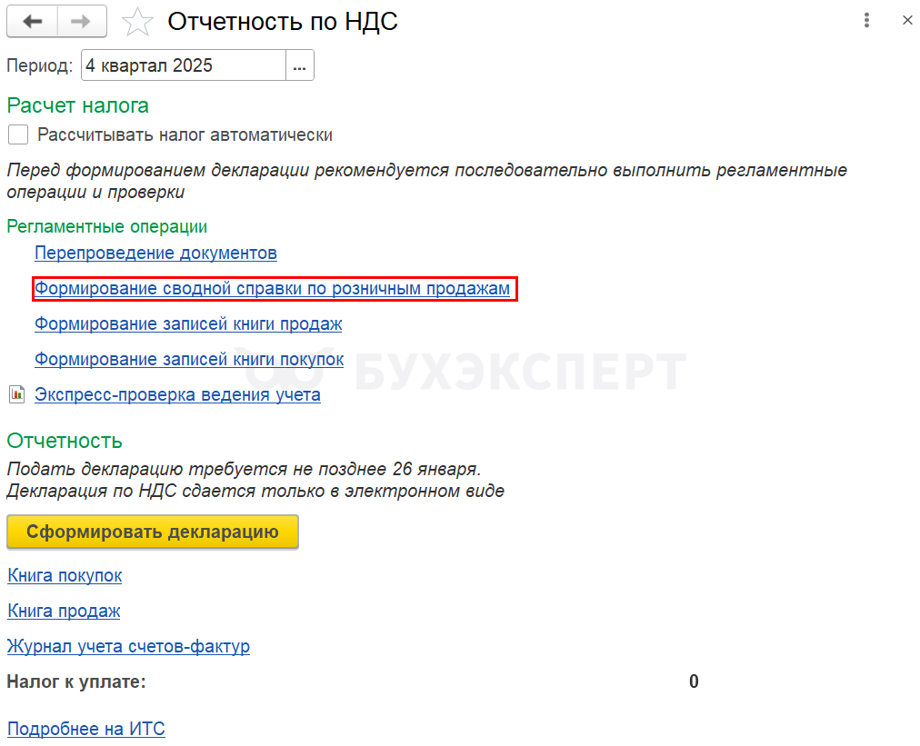 Cформируйте сводную справку по розничным продажам из Помощника по учету НДС (раздел Отчеты — Отчетность по НДС).