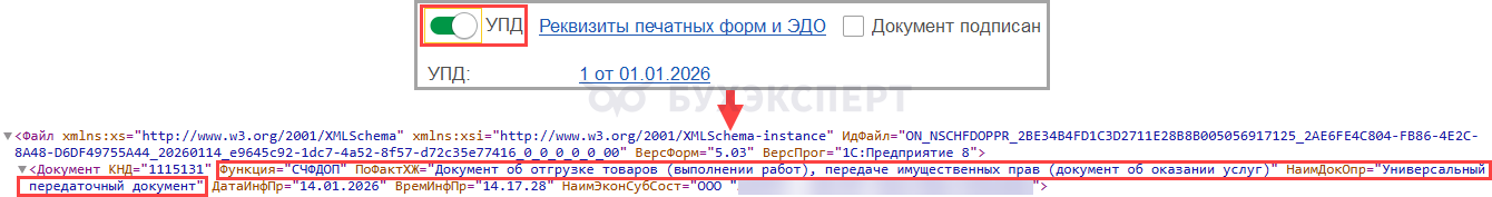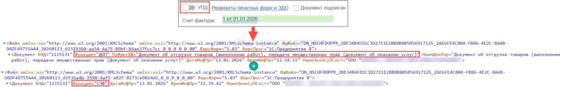 При установленном переключателе формируется УПД со статусом 1 (СЧФДОП).