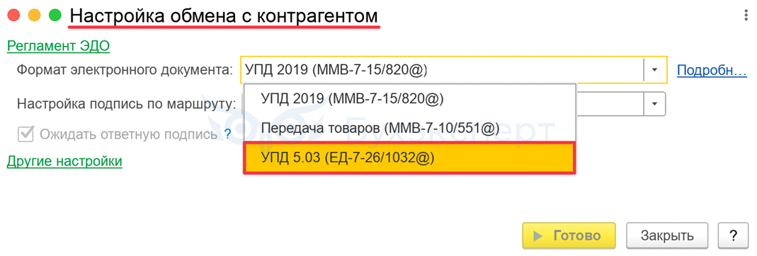 В поле Формат электронного документа выберите УПД 5.03 (ЕД-7-26/1032@) и нажмите Готово.